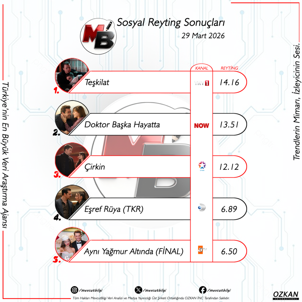 Televizyon yayıncılığının kuralları yeniden yazılırken, bir yapımın gerçek başarısını ölçmenin tek yolu artık sadece geleneksel kumanda verilerinden geçmiyor. İzleyiciler, ellerindeki akıllı telefonlarla ekran karşısında aktif birer “trend mimarı”na dönüşmüş durumda. Her bir sahne, her bir diyalog ve hatta karakterlerin anlık bakışları bile saniyeler içinde sosyal medyada binlerce etkileşime dönüşebiliyor. Tam da bu noktada, Türkiye’nin en büyük veri araştırma ajansı MevcutBilgi tarafından titizlikle hazırlanan 29 Mart 2026 sosyal medya reyting sonuçları, sektörün dijital nabzını kusursuz bir şekilde gözler önüne seriyor.