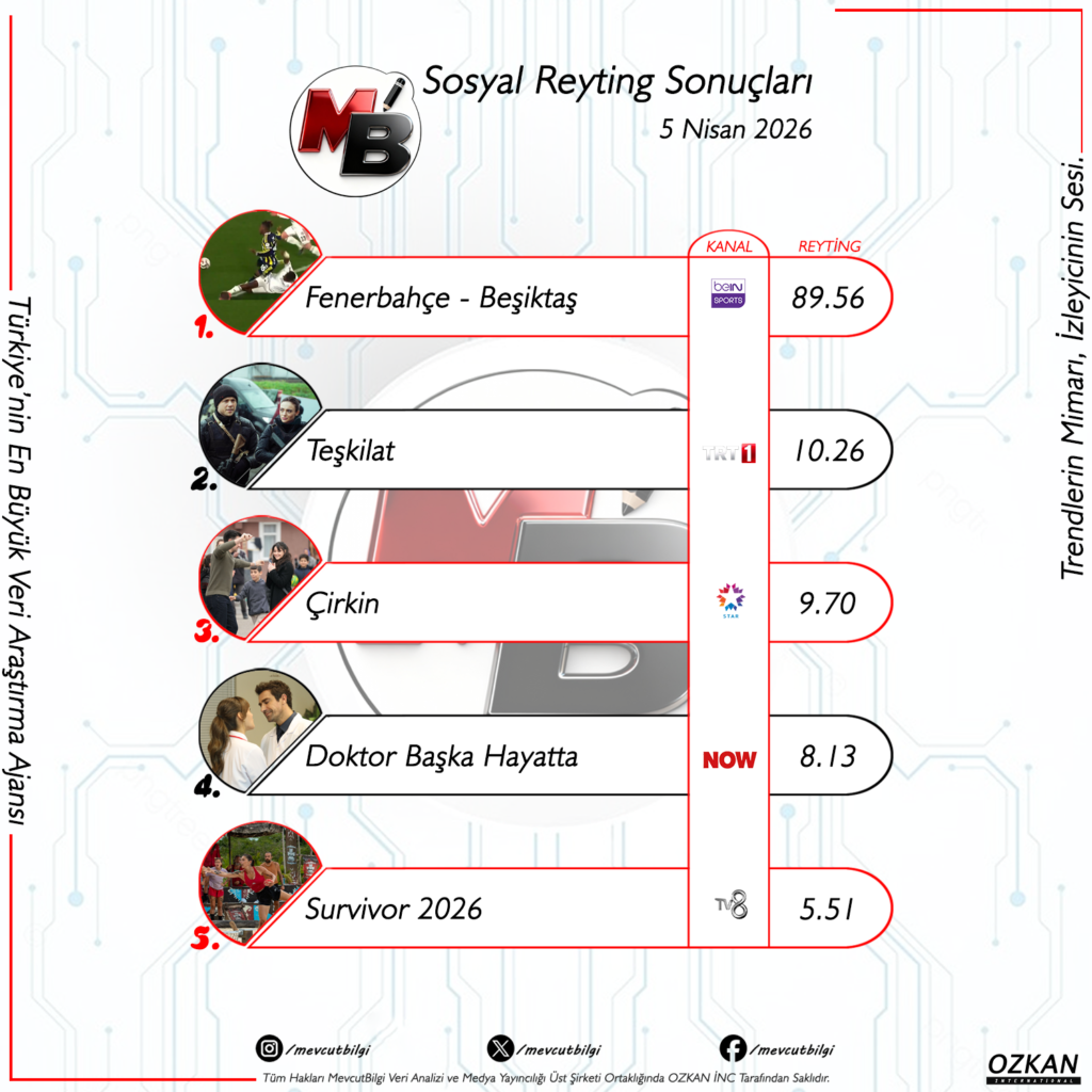 Kurgu dizilerin domine ettiği sosyal medya arenasında, kurgu dışı ve reality formatlarının gücünü de asla yadsıyamayız. Listenin dikkat çeken diğer yıldızları; 8.12 reyting oranıyla ekranların değişmez rekabet adresi Survivor 2026 ve 6.10 oranla gündüz kuşağının nabzını tutan Esra Erol’da oldu.