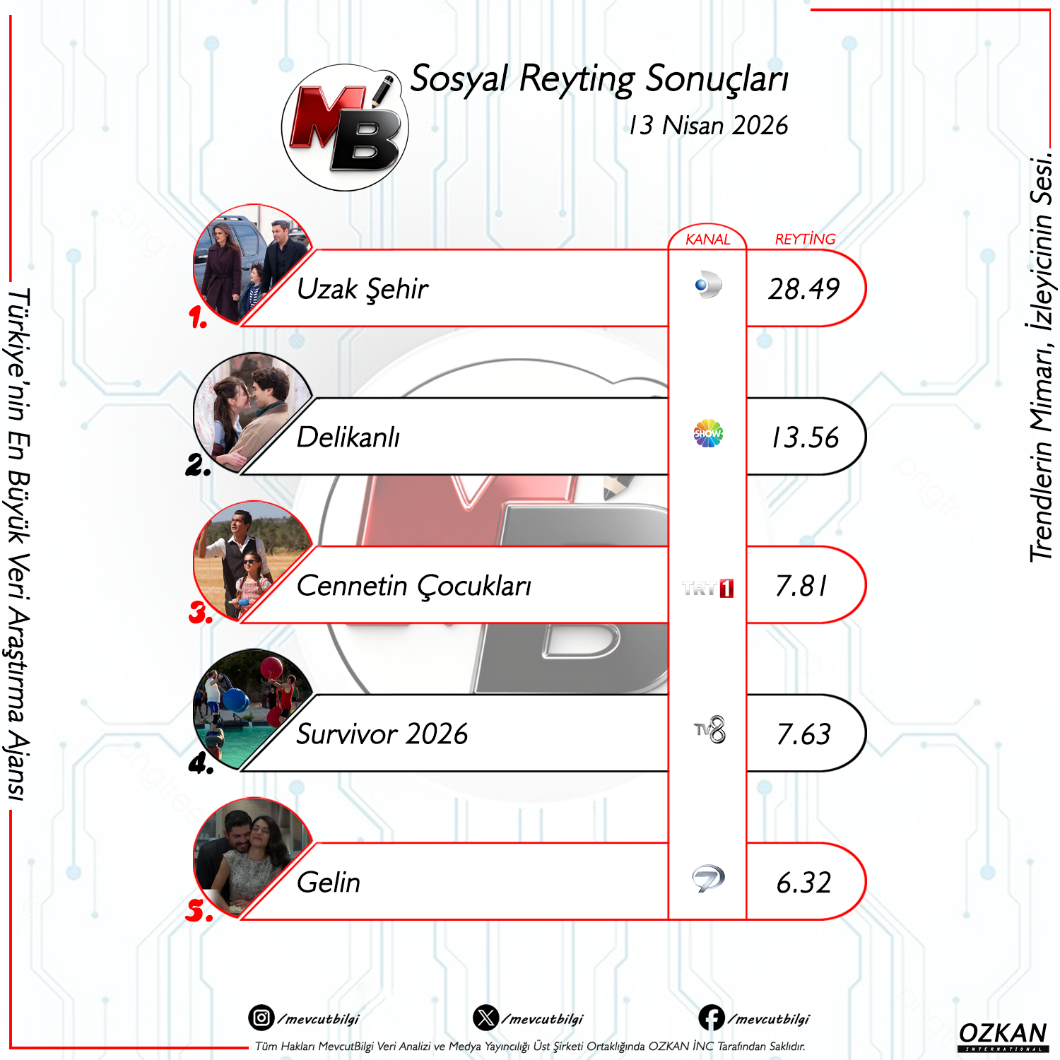 13 Nisan 2026 Sosyal Reyting Sonuçları: Pazartesi Gecelerine “Uzak Şehir” Ambargosu! Televizyon dünyasında yeni bir haftanın başlangıcı, her zaman en çetin yayın savaşlarının verildiği, kanalların en güçlü kozlarını sahaya sürdüğü