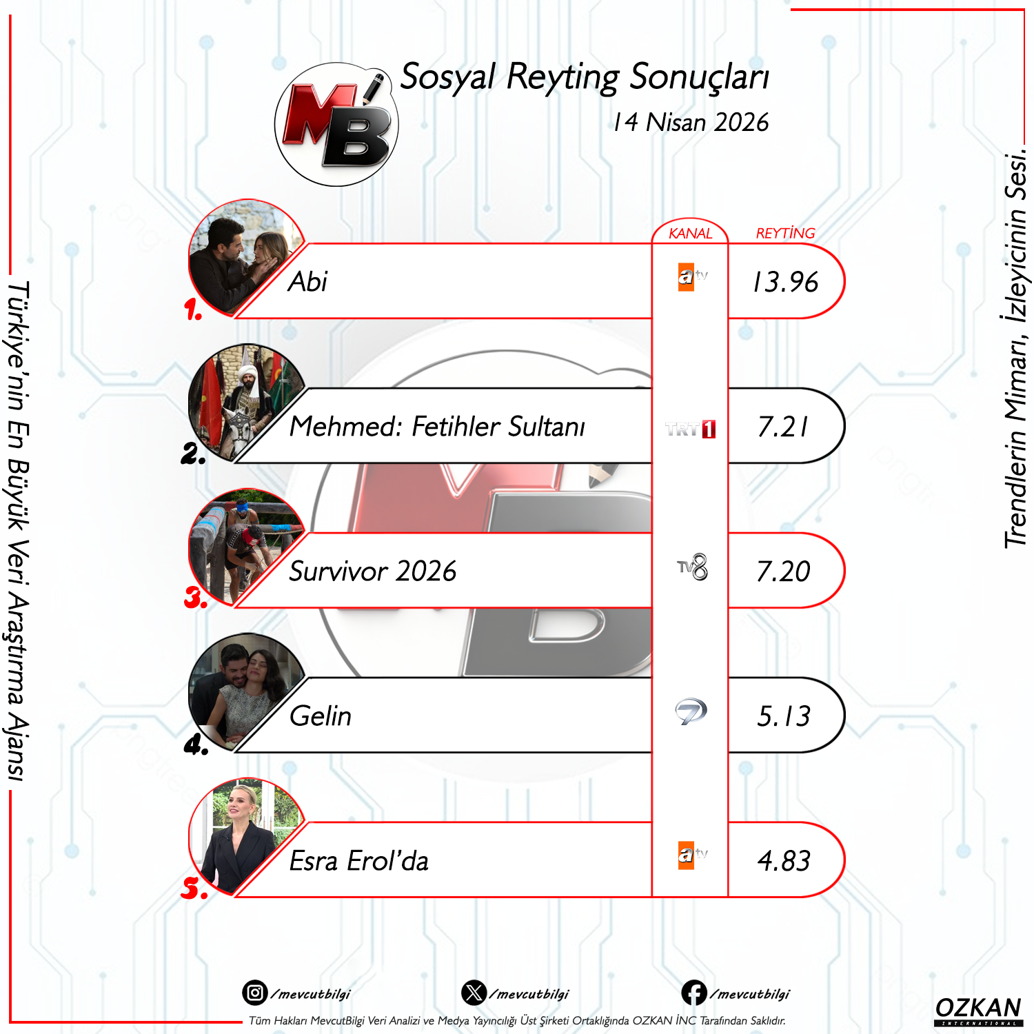 14 Nisan 2026 Sosyal Reyting Sonuçları: Ekranların ve Dijitalin Zirvesindeki İsimler Belli Oldu! Televizyon dünyasında başarının ölçütü artık sadece ekran başında geçirilen saatlerle değil, dijital dünyada yaratılan yankı ile de